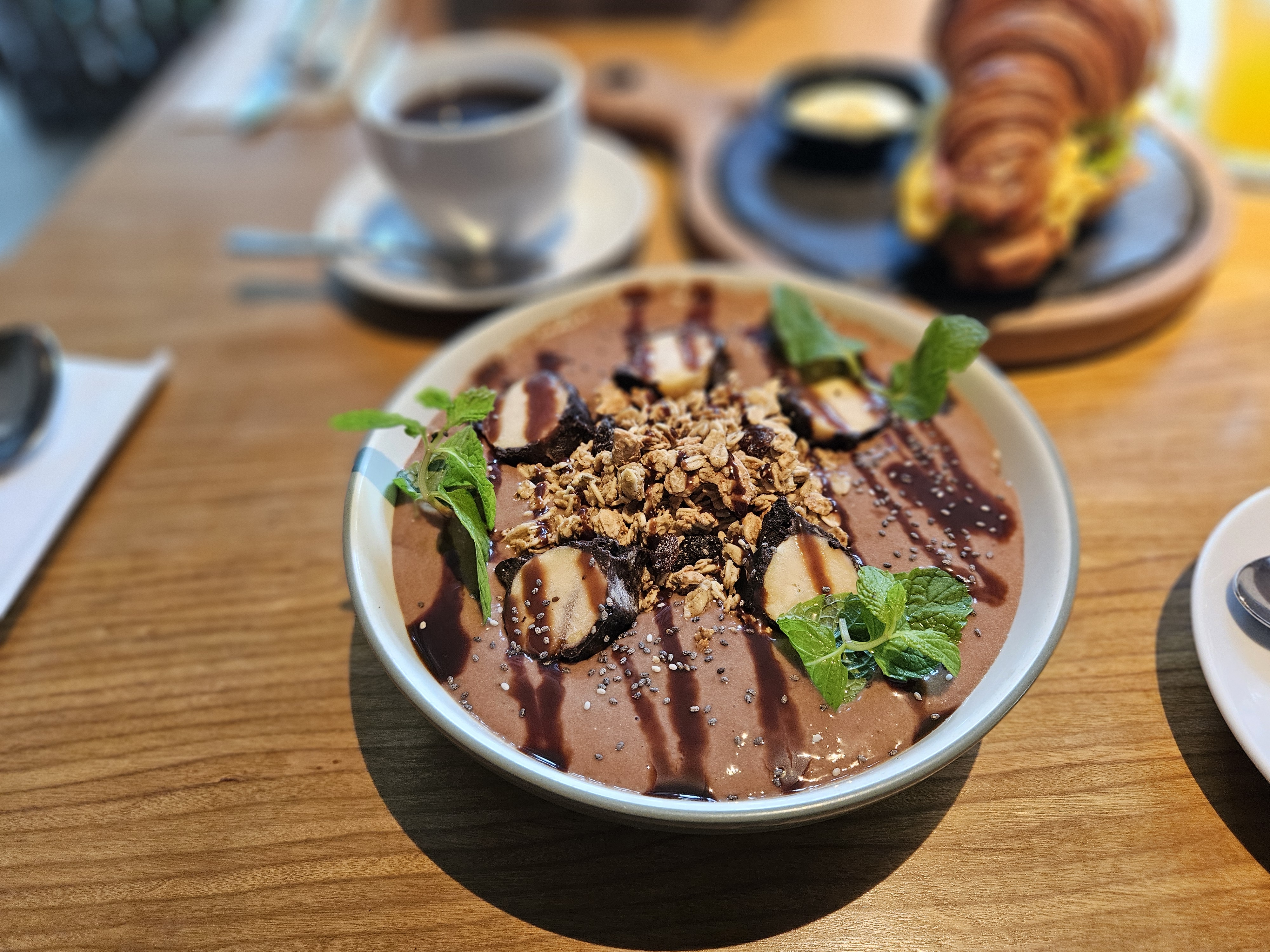 바나나초코스무디볼과 베이컨 에그 아보카도 크로와상, 정확한 이름이 기억이 안나 미안. 드래곤프룻 스무디볼을 시켰다면 색이 쨍쨍하니 예뻤을텐데, 아무튼, 양도 넉넉하고 맛도 좋았다. 기대한 만큼은 아니었지만, 훌륭했다.